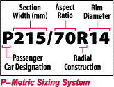 The p-metric size system is the U.S. version of the metric sizing system that was established in 1976. P-metric passenger car tire sizes begin with a “P,” which stands for “Passenger,” and means that the tire is engineered to standards set by the TRA. If there is no “P” the tire is engineered to ETRTO standards and is a metric tire. Then comes the section width in millimeters, the aspect ratio, the radial designation, and the rim diameter. The p-metric system is widely used by U.S. domestic tire manufacturers and is essentially a conversion of the numeric system in which section widths are expressed in millimeters instead of inches. TRA standards also generally allow for a higher maximum tire pressure for a given p-metric size so as to give the tire less rolling resistance.